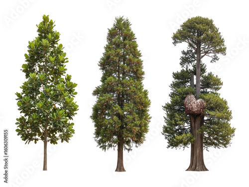 Tall evergreen and conifer trees with transparent background, including unique trunk growths and dense foliage for natural design