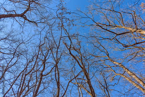 Tall Forest Up Above. Mighty tree in winter leaves. Look up at the bare branches