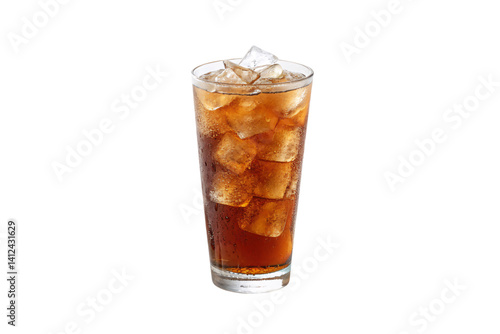 Tall glass filled with chilled black tea and ice cubes, condensation droplets signal refreshing coolness, isolated on a transparent background