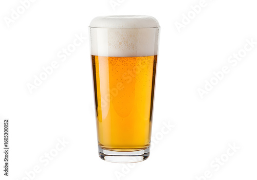 Tall glass of golden beer with frothy head isolated on transparent background