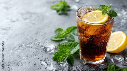Tall glass of iced cola with lemon slice and mint garnish on concrete background, ideal for menu designs, summer drink campaigns, and cooling refresh ads