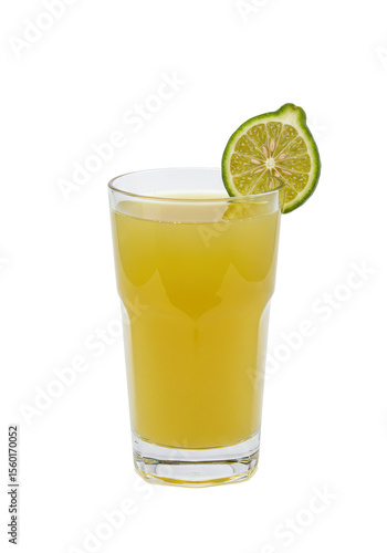 Tall glass of yellow beverage with a slice of green fruit, on a black isolated background