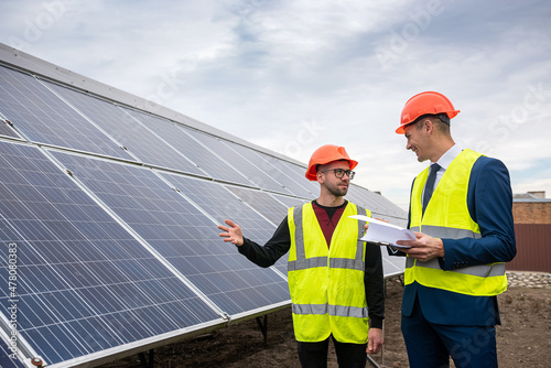 tall men in work clothes are considering whether to install solar panels in the open air.