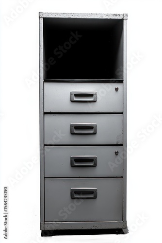 Tall metal filing cabinet with four drawers and one open shelf, gray color with worn edges and handles, isolated on white background