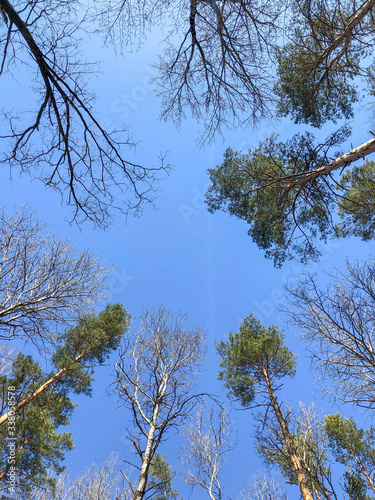 Tall trees without leaves in the forest against the blue sky. Abstract natural background.