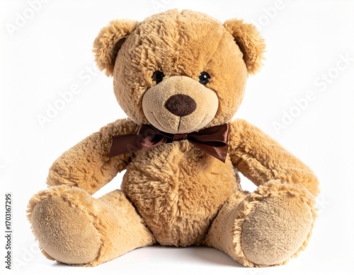 Tan Brown Plush Teddy Bear with Brown Bow Tie Isolated on White Background