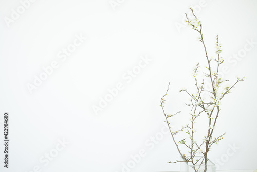Tangle of hawthorn branches. White flowers on a white background. Copy space