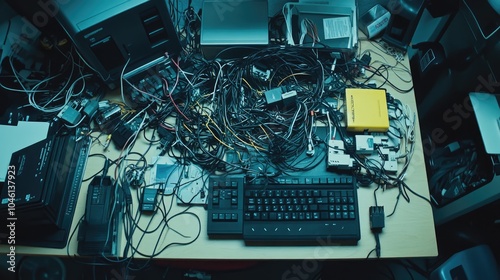 Tangled Wires and Cables on a Desktop Surface