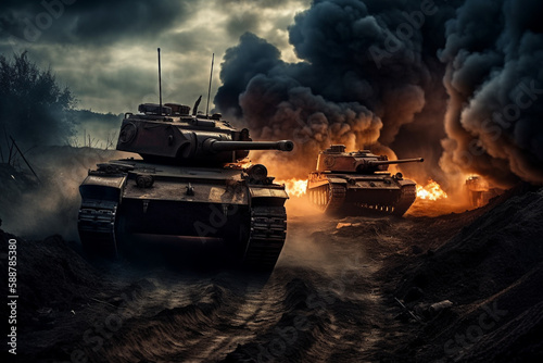 Tanks in a fierce battle with fire and smoke, representing the devastation and destruction of war. Ai generated