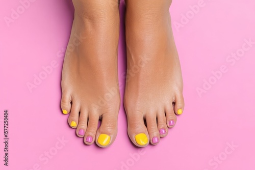 Tanned toes with neon palette dance on pink canvas, embracing Color Day vibrance and quirky, playful International Pedicure Week