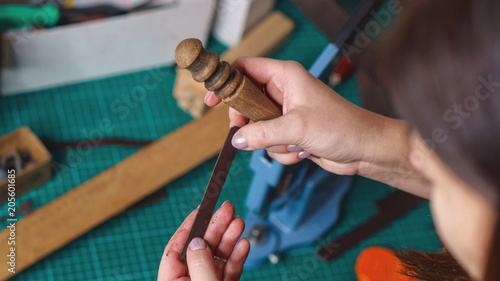Tanner holds piece of leather and slicker in her hand. Workflow in workshop. Shooting close-up.