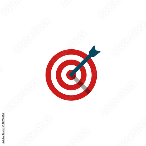 Target dart red circle board with arrow in center flat vector icon. Dartboard in red with blue arrow success concept icon.