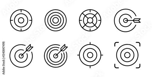 Target icons set. Goal symbol collection. Simple target with arrow. Darts icon. Hitting the bullseye icon line and flat style. Set of success target icons. Set of 5 outline icons.