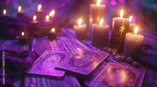 tarot cards on an esoteric style table with lit candles and purple atmosphere
