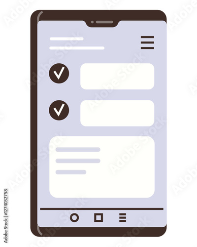 Task management interface on smartphone screen featuring checkmarks for completed tasks, blank text fields, and navigation icons. Ideal for productivity, to-do lists, organization, apps, UI design