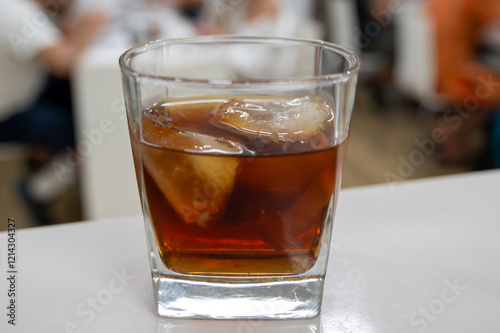 Tasting Sherry sweat cream wine on ice rocks, jerez fortified wine made from palomino white grape served in Jerez de la Frontera, Cadiz, Andalusia, Spain