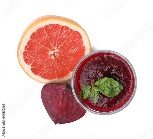 Tasty beetroot smoothie with basil in glass, fresh vegetable and grapefruit isolated on white, top view. Vegan drink