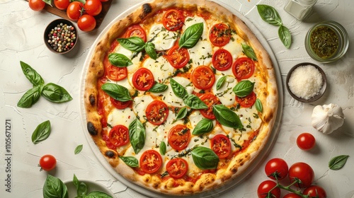 Tasty Caprese pizza and ingredients on white table, top view