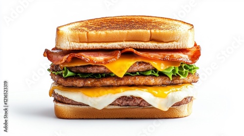 Tasty fast food breakfast sandwich stacked with cheese and crispy bacon isolated on white. Generative AI