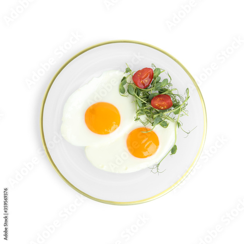 Tasty fried eggs with tomato and sprouts isolated on white, top view