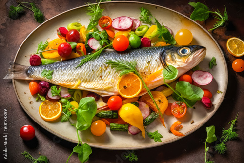 Tasty grilled dorada fish with vegetables and sauce on wooden background. Ai generated