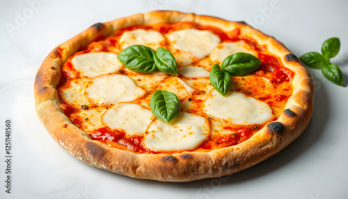 Tasty margherita pizza topped with fresh basil leaves on a transparent background, Side lit. with white shades