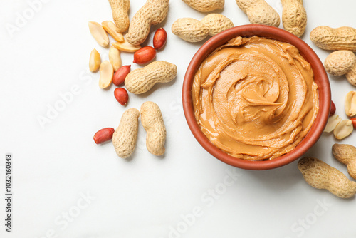 Tasty peanut butter in bowl and groundnuts on white table, flat lay. Space for text