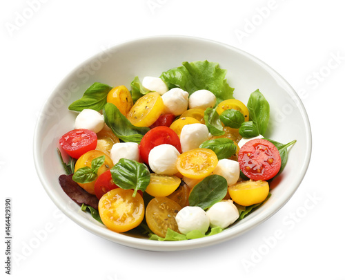 Tasty salad with yellow tomatoes, basil and mozzarella cheese isolated on white