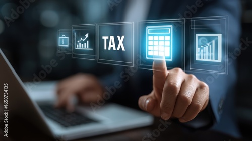 Tax Analysis: A hand pointing towards the TAX icon, symbolizing financial planning and calculations on a screen. this picture presents the concept of tax season.