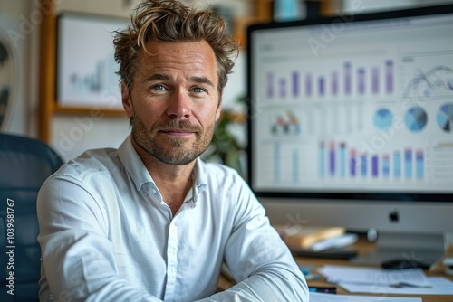 Tax consultant explaining VAT invoice essentials, looking directly at the camera, large monitor turned away, desk with tax document samples neatly arranged