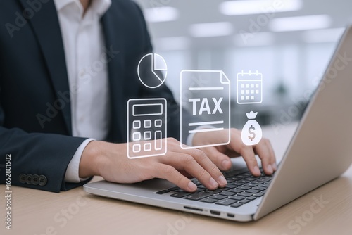 Tax Preparation and Filing: Businessman Calculating and Managing Taxes Online with Laptop in Office