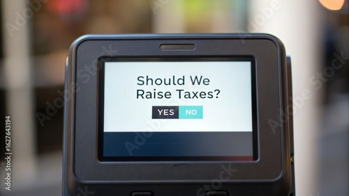 tax+rate+debate A digital screen poses the question, "Should We Raise Taxes?" with options for yes or no.