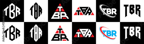 TBR letter logo design in six style. TBR polygon, circle, triangle, hexagon, flat and simple style with black and white color variation letter logo set in one artboard. TBR minimalist and classic logo