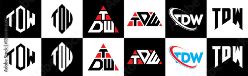 TDW letter logo design in six style. TDW polygon, circle, triangle, hexagon, flat and simple style with black and white color variation letter logo set in one artboard. TDW minimalist and classic logo