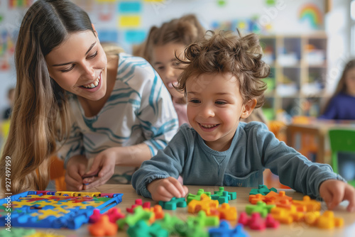 Teacher and toddler playing with maths puzzle game sitting on the table at kindergarten.