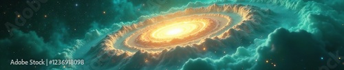 Teal and white swirls dance in the golden nebula's heart, nebula, nebulae