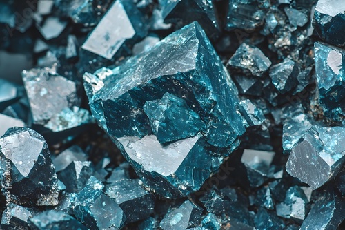 Teal Blue Crystal Cluster Gemstone Mineral Texture Background Close up Macro Shot of Rough Cubic