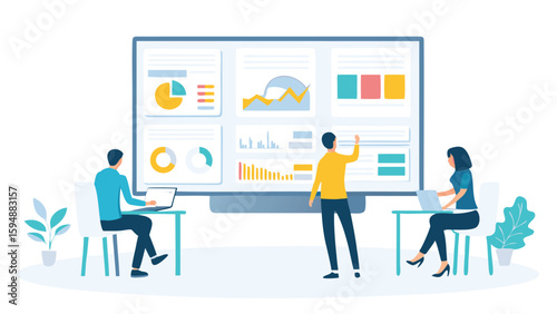 Team analyzing data dashboards on a large screen with laptops and charts for business insights