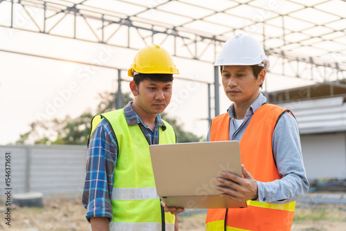 Team architect, colleague builder asian young male, man worker wearing safety helmet, using laptop computer discussing, inspecting reconstructed construction building renovation, check defect at site.