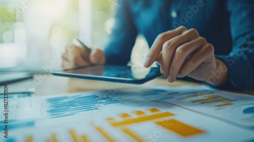 Team Collaboration on Financial Analysis and Future Planning with Tablet in Office Room