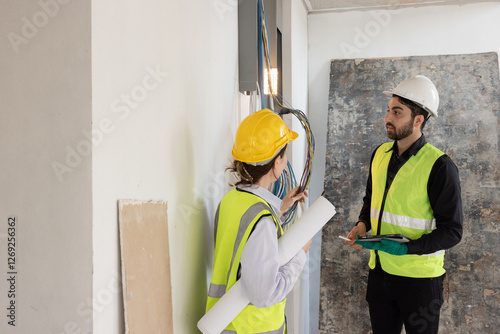 team electrical engineers or technicians is professionally inspecting the wiring and systems in the building. Check electrical equipment to meet safety standards. Use a tablet to check buildings.