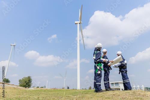 Team engineer wind turbine worker safety uniform survey discuss operational planning windmill field clean energy. Alternative technology protect environment reduce global warming problems.