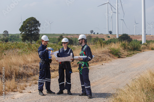 Team engineer wind turbine worker safety uniform survey discuss operational planning windmill field clean energy. Alternative technology protect environment reduce global warming problems.