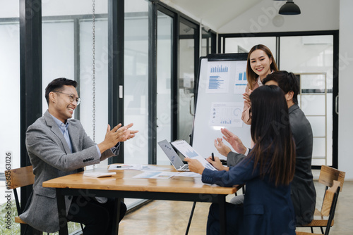 Team Meeting Collaboration: A diverse team engages in a productive meeting, reviewing data and collaborating on projects, showcasing effective communication and teamwork in a modern office setting.