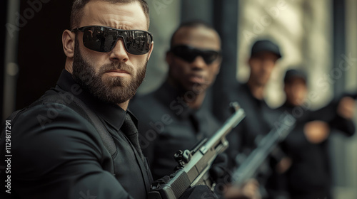Team of armed security guards protecting a modern office building
