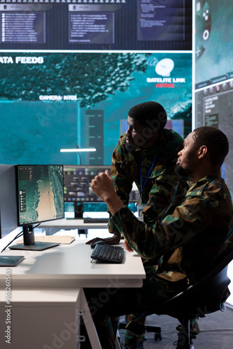 Team of army experts in a command post power base monitors satellite footage, collecting real time data and transmitting important details for a n operational success. Help with decision making.