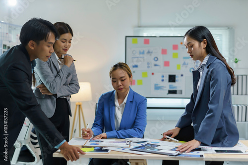 Team of asian business people are gathering around a table, analyzing financial documents and planning their next business strategy