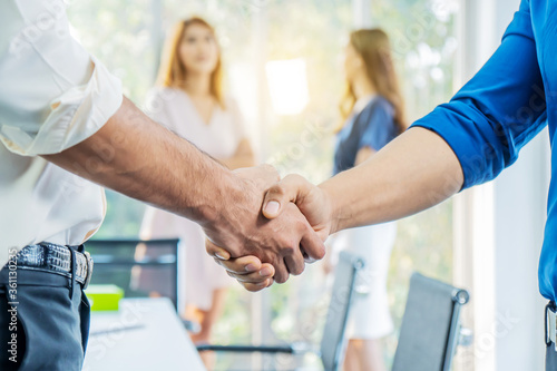 Team of business people negotiating an agreement closing the deal with handshake, Congratulations and Confirmation in the agreement investment together.