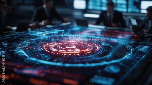 Team of business professionals analyze holographic data on interactive screen in modern high tech command center environment for strategic planning.