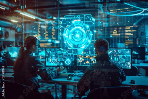Team of cybersecurity experts monitors holographic interface with shield icon, symbolizing advanced digital defense mechanisms in high-tech environment.